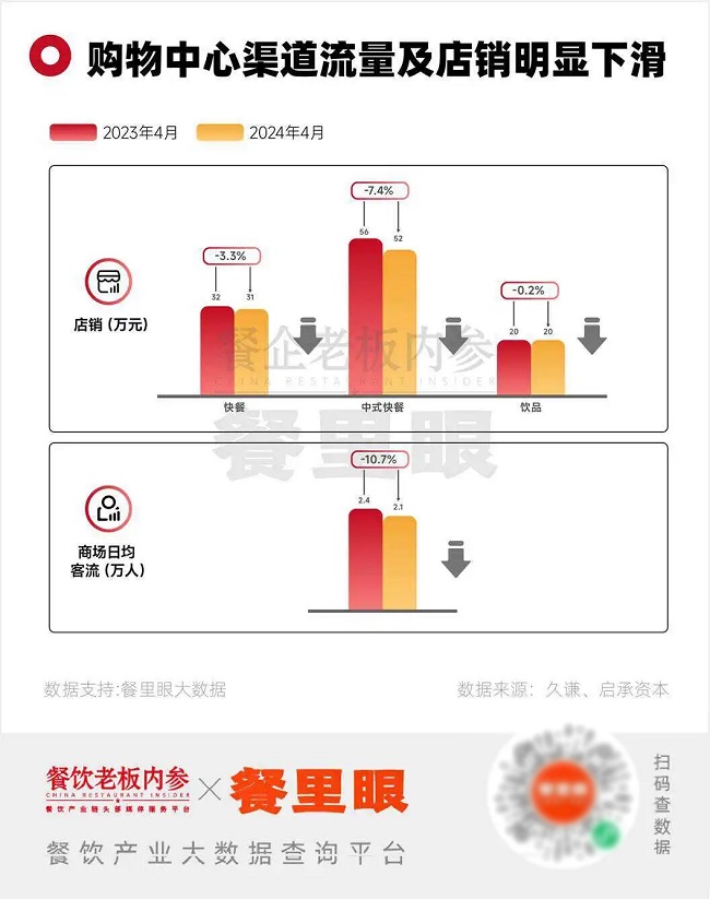 首當(dāng)其沖的,是門店客流下滑。 據(jù)久謙數(shù)據(jù),2024年商場(chǎng)日均客流更顯著的下滑,超過(guò)了接近10%。受此影響,快餐、中式正餐、飲品等門店店銷均有所下滑。