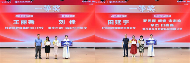 最終,經(jīng)過激烈角逐,“教育本質論述”組王麗堯、“智慧課堂”組劉佳、“AI工具應用”組田延宇、“MG知識動畫”組羅民源團隊獲得一等獎,重慶市龍門浩職業(yè)中學校劉佳、湖南機電職業(yè)技術學院易丹獲得“人氣之星”榮譽稱號。